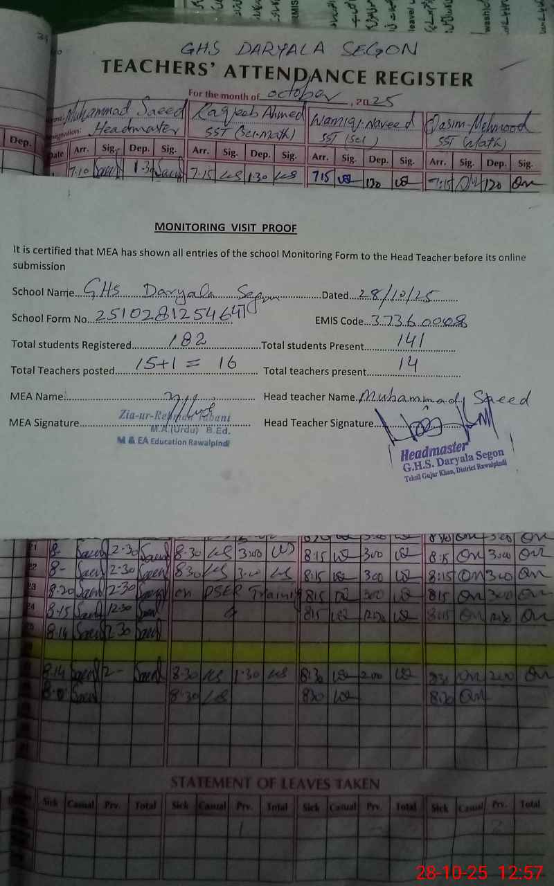 | Attendance Register | Head Teacher | MEA with School | Visit Proof |