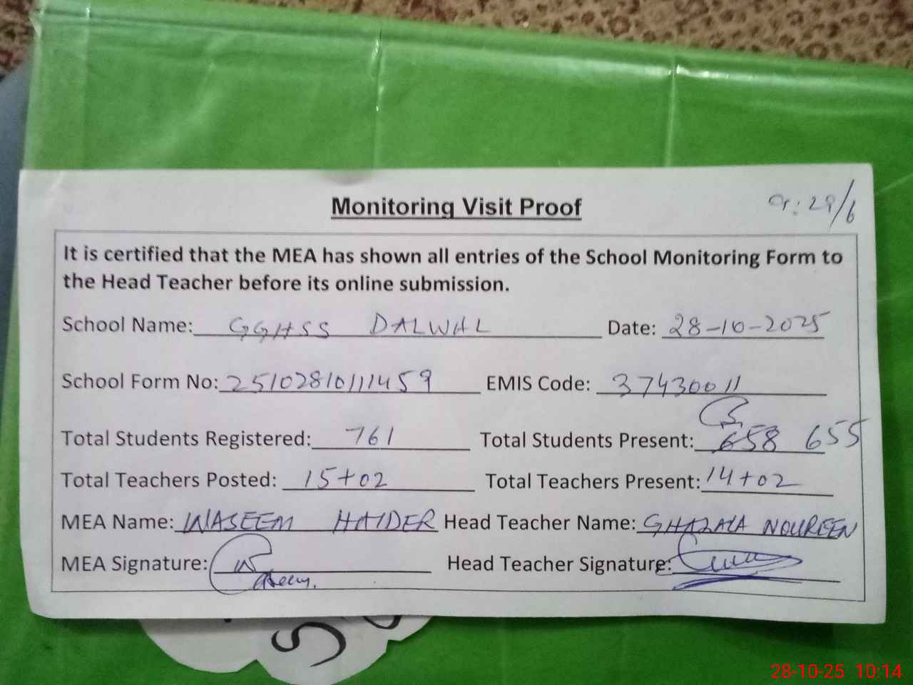 | Certified that this School was Inspected by the Undersigned MEA/DMO Today and the Information Stated Above is as Per Record. | |||||