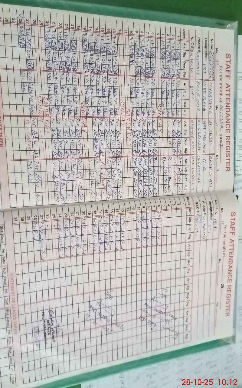 | CNIC | Full Name | Designation | R/C | Absence During Last Calender Month |