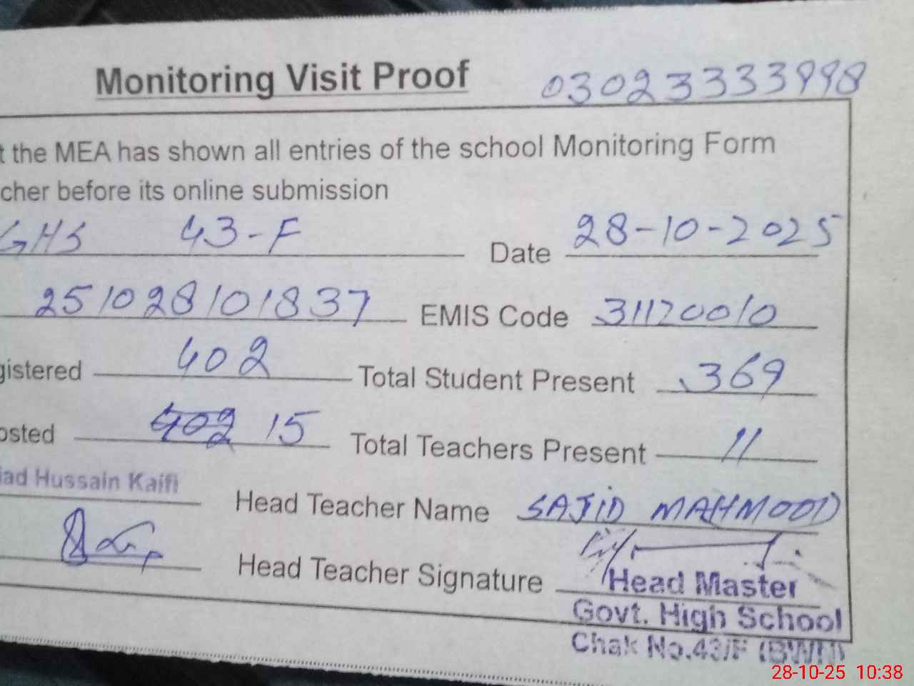 | Name: SA**** MA**** Designation: (School Headmaster's/Headmistress's) HM Phone/Cell Number: 03**** |