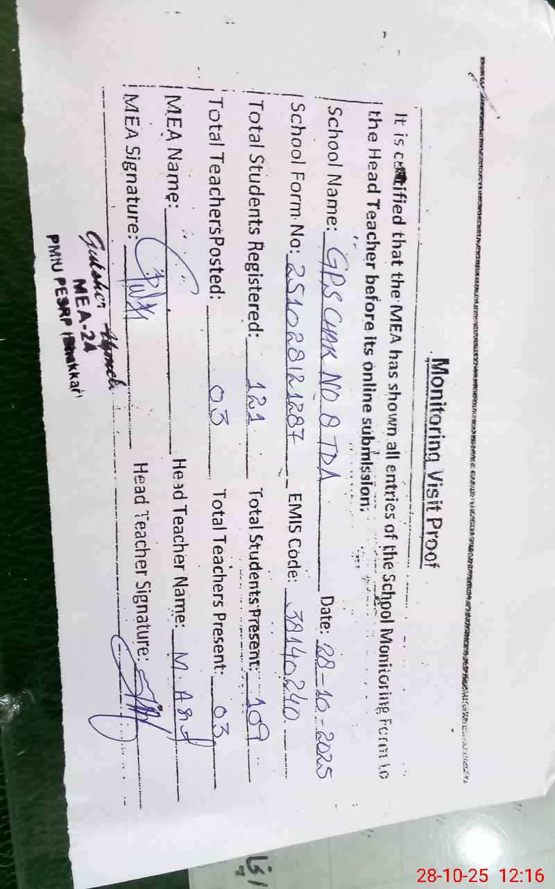 | EMIS Code: 38140249 | Name of School: GPS CHAK NO 8 TDA | |||