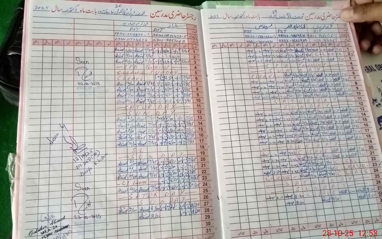 | CNIC | Full Name | Designation | R/C | Absence During Last Calender Month |