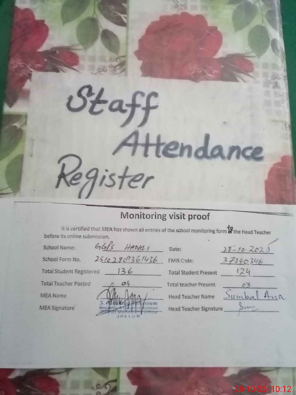 | Attendance Register | Head Teacher | MEA with School | Visit Proof |