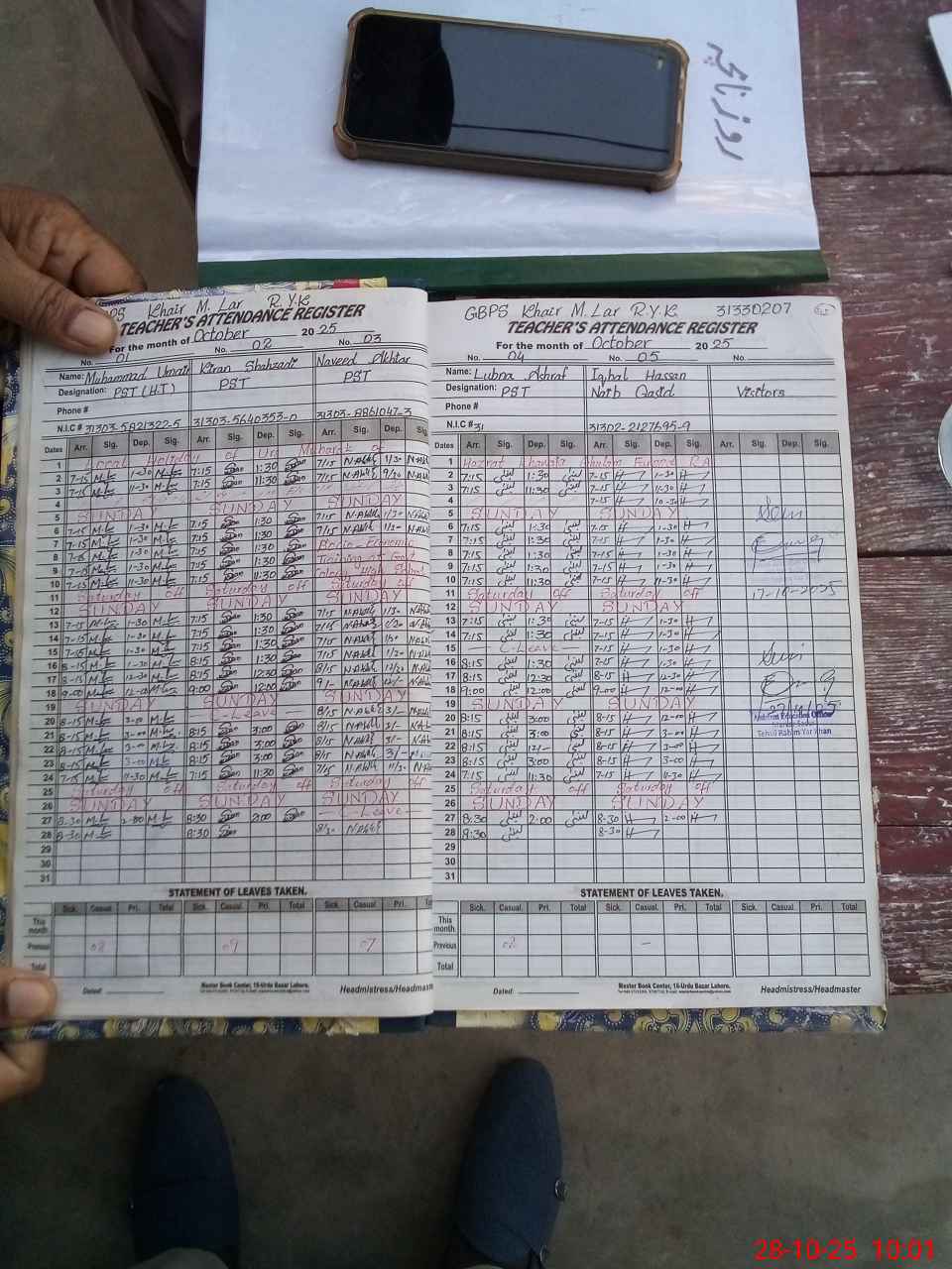 | CNIC | Full Name | Designation | R/C | Absence during last cal. month |