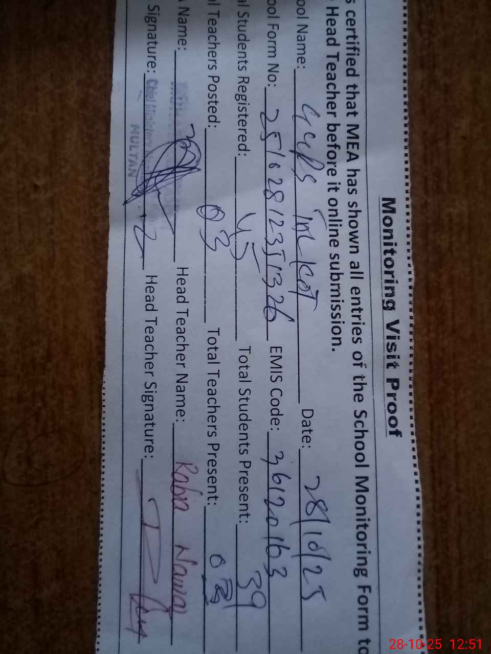 | Attendance Register | Head Teacher | MEA with School | Visit Proof |