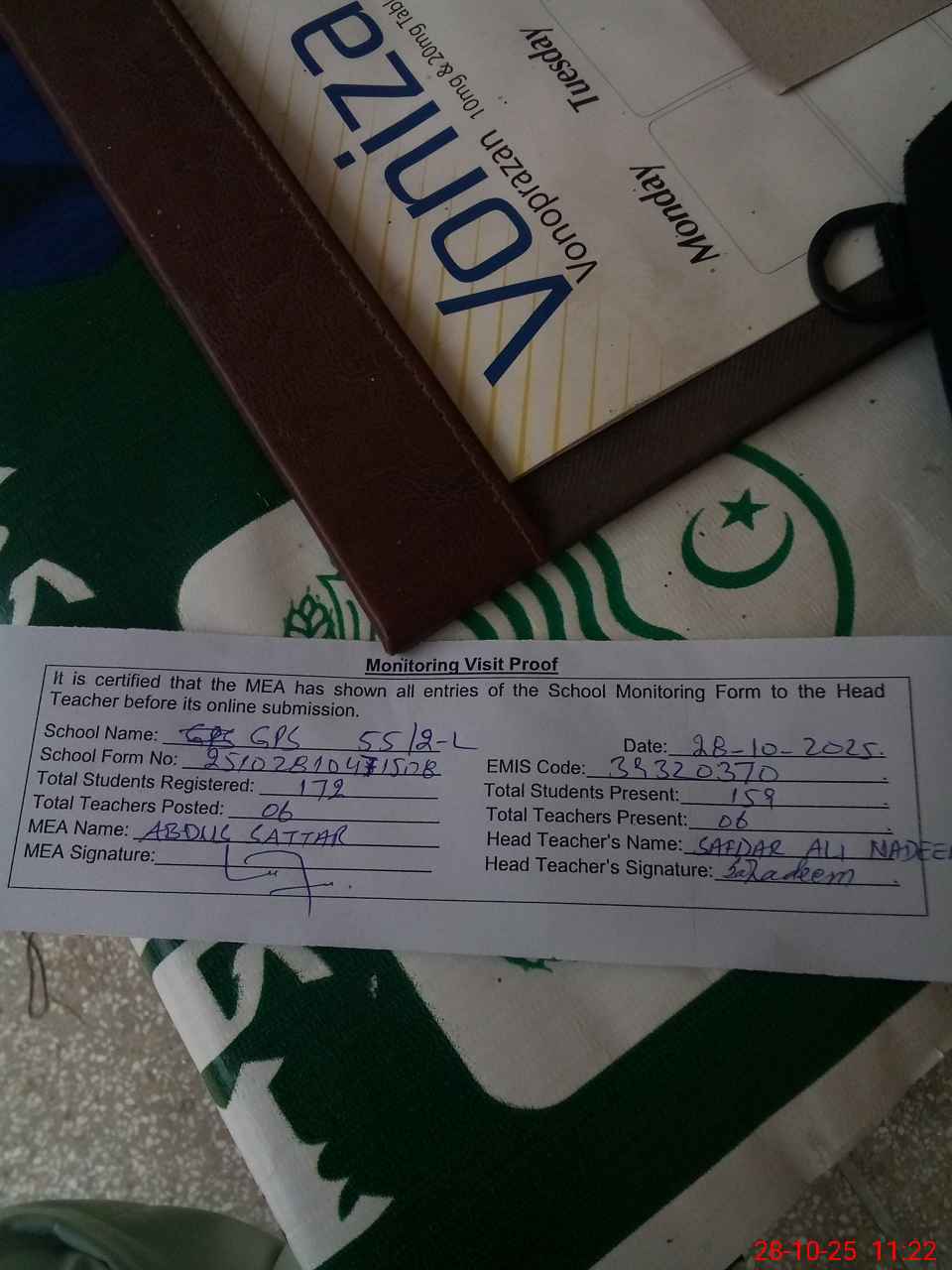 | Attendance Register | Head Teacher | MEA with School | Visit Proof |