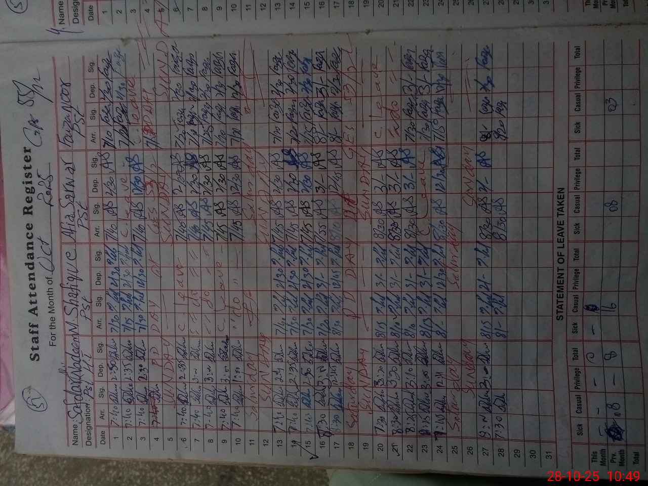 | CNIC | Full Name | Designation | R/C | Absence During Last Calender Month |