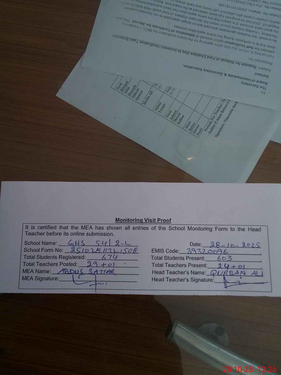 | Attendance Register | Head Teacher | MEA with School | Visit Proof |