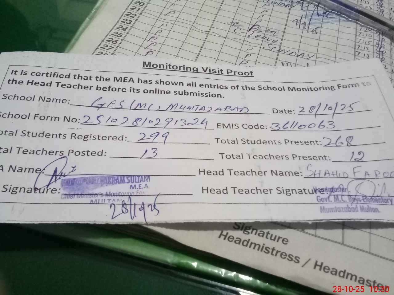 | Attendance Register | Head Teacher | MEA with School | Visit Proof |