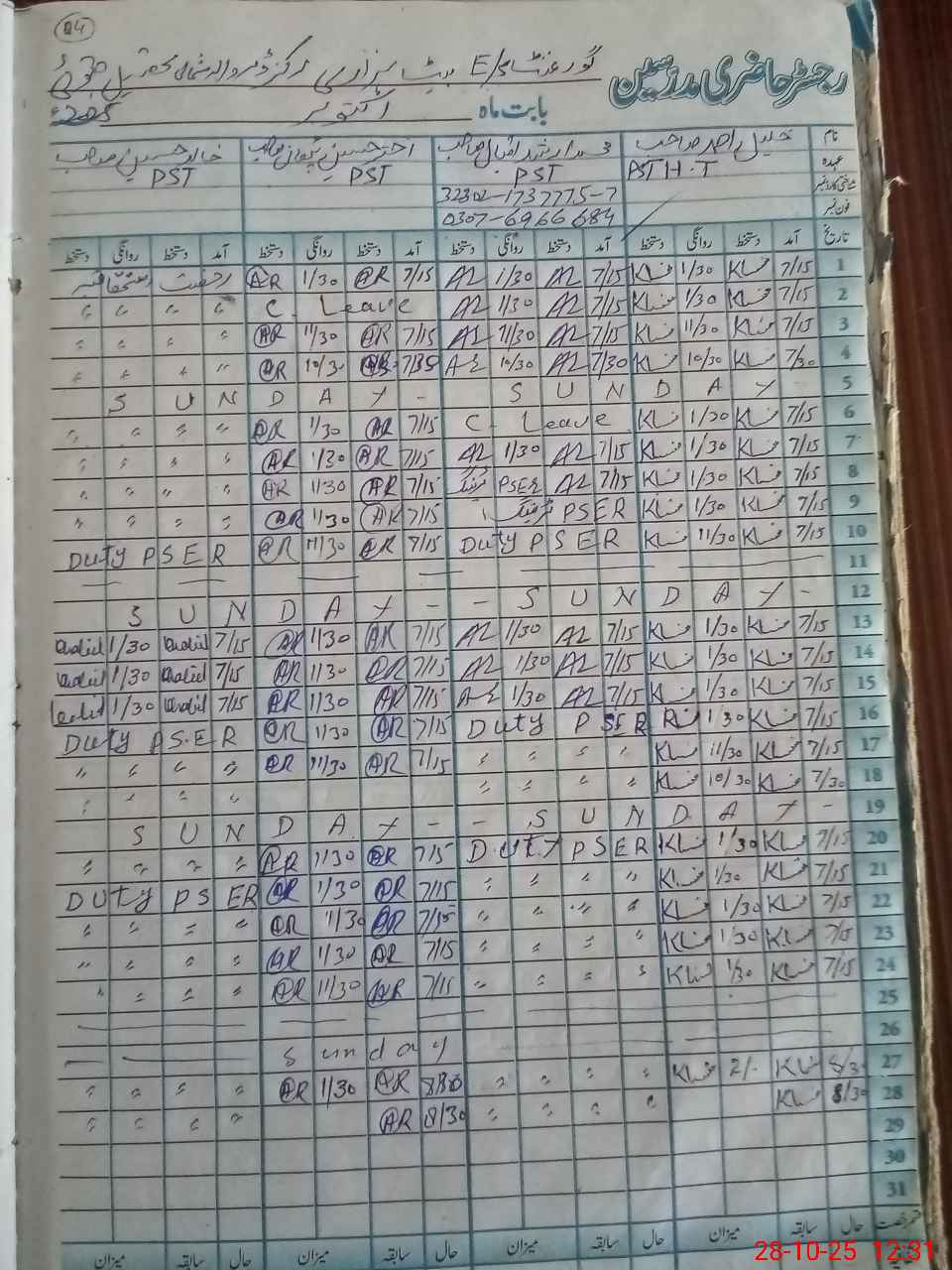 | CNIC | Full Name | Designation | R/C | Absence During Last Calender Month |