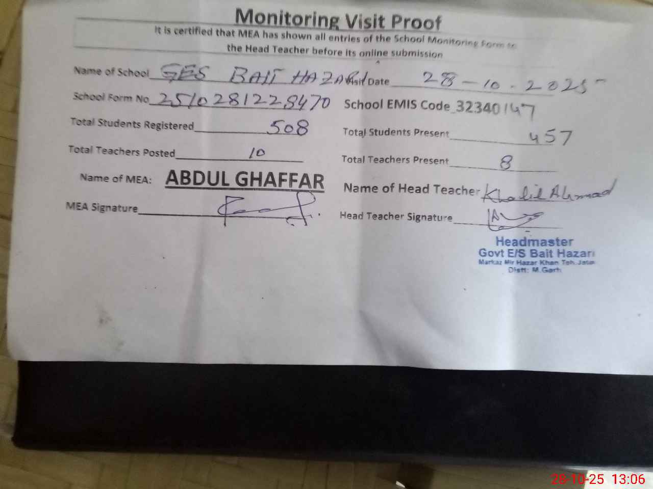 | Attendance Register | Head Teacher | MEA with School | Visit Proof |