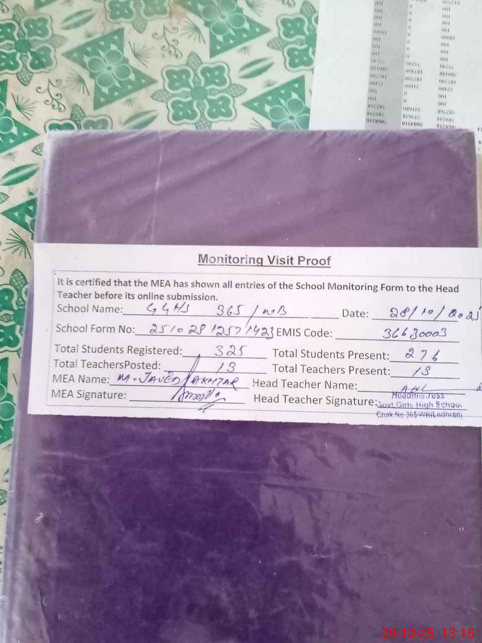 | Attendance Register | Head Teacher | MEA with School | Visit Proof |