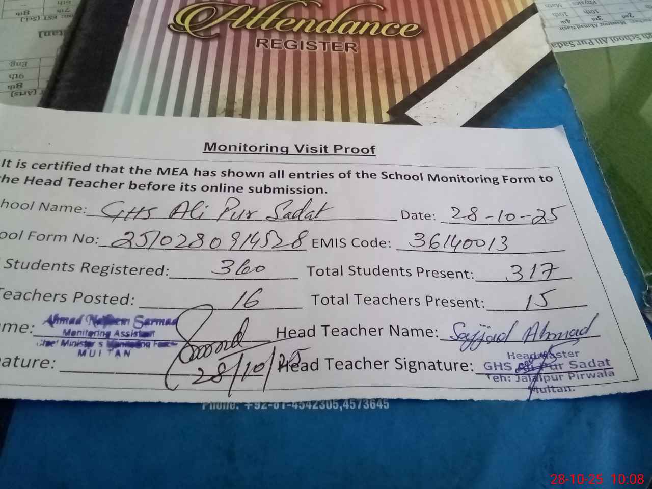| Attendance Register | Head Teacher | MEA with School | Visit Proof |
