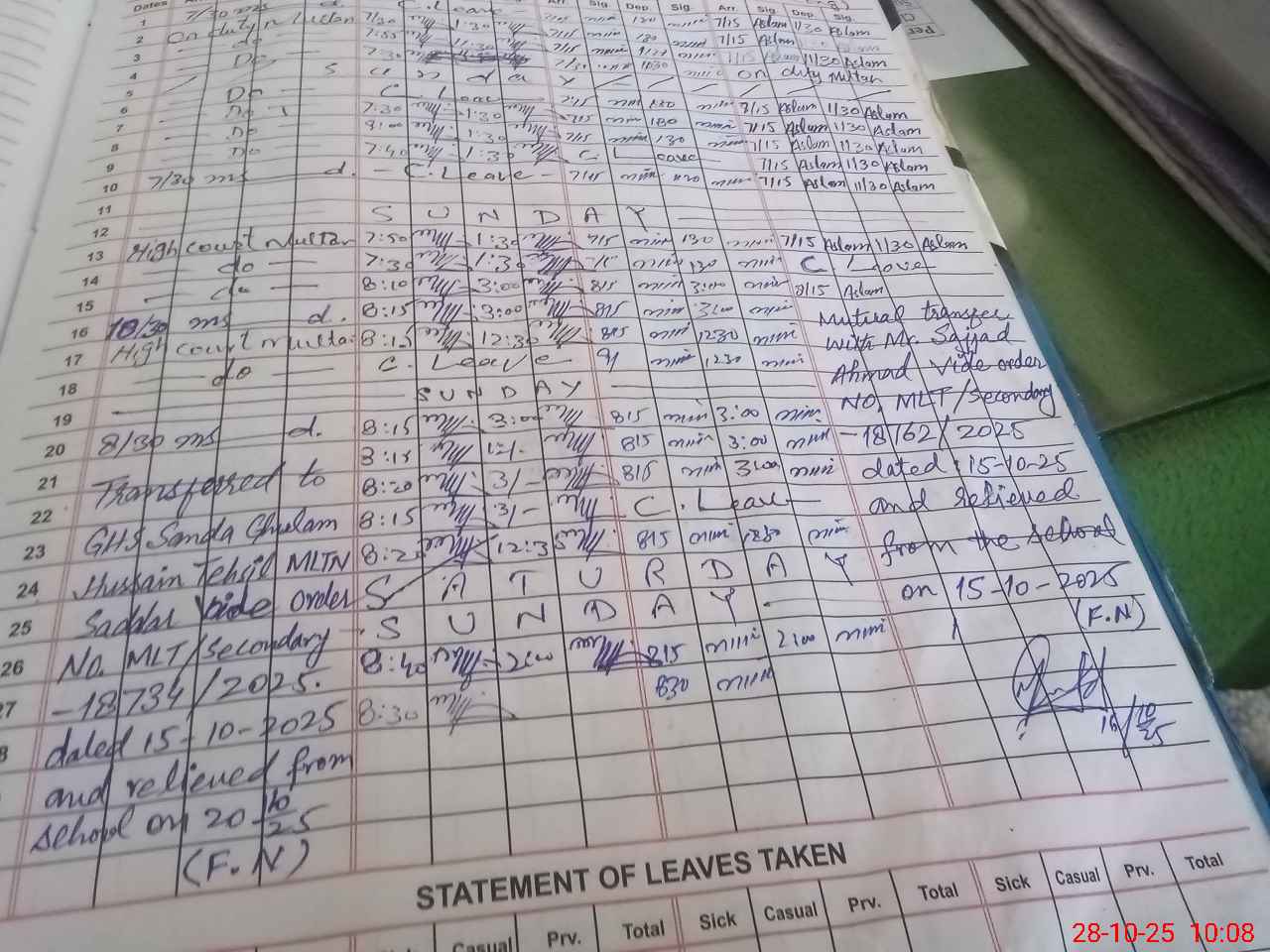 | CNIC | Full Name | Designation | R/C | Absence During Last Calender Month |