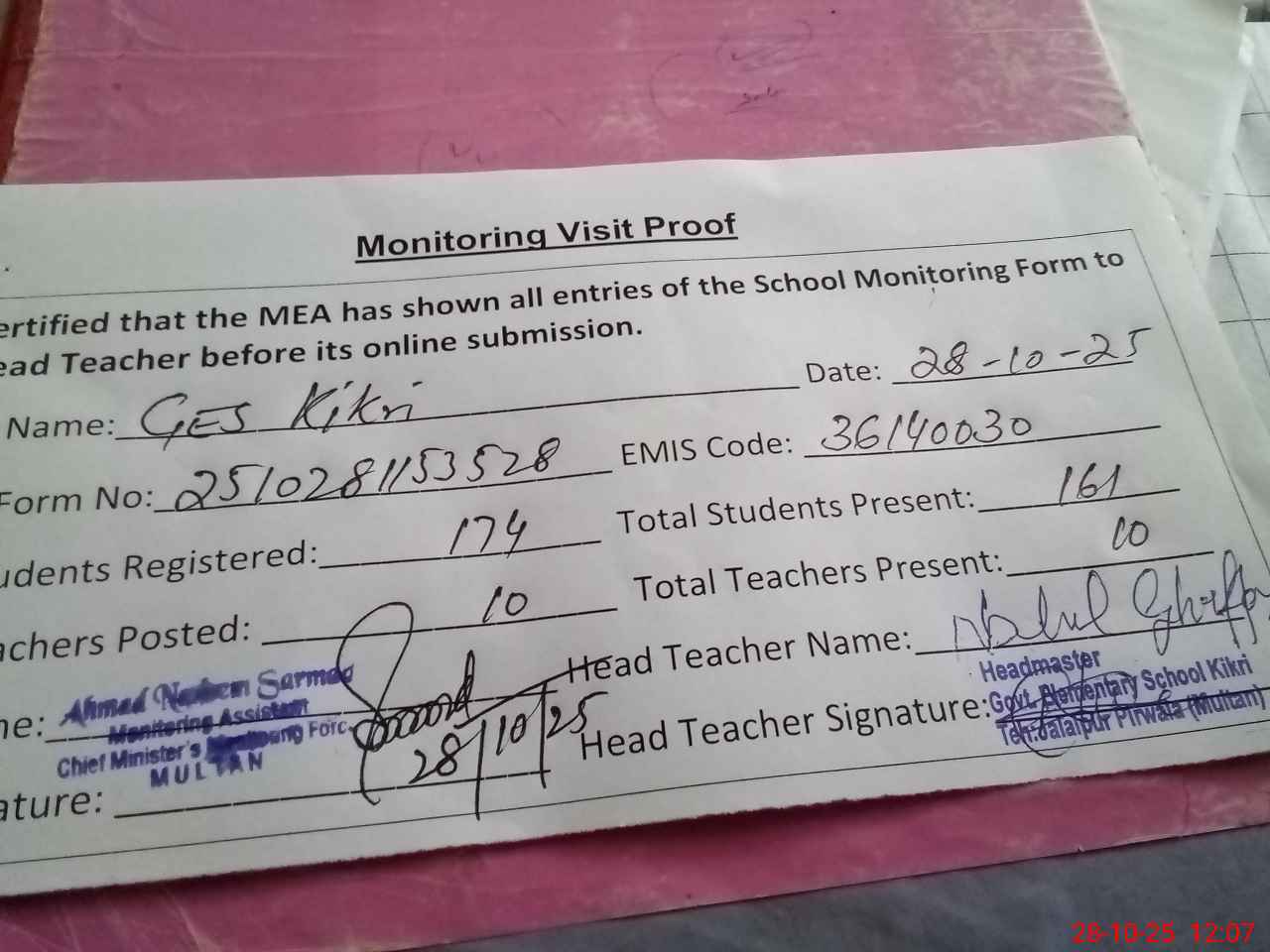 | Certified that this School was Inspected by the Undersigned MEA/DMO Today and the Information Stated Above is as Per Record. | |||||