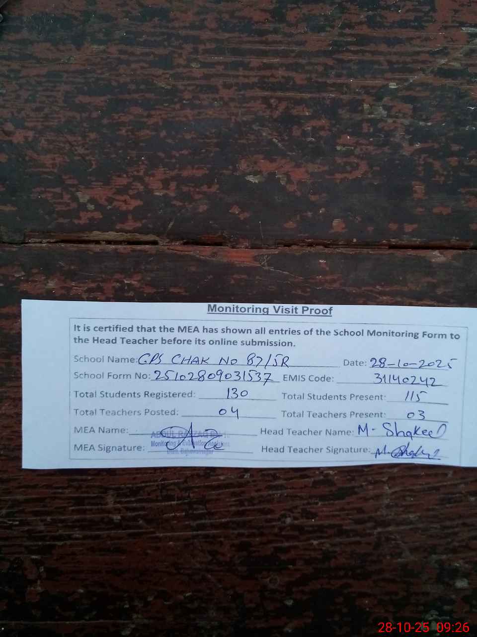 | Attendance Register | Head Teacher | MEA with School | Visit Proof |