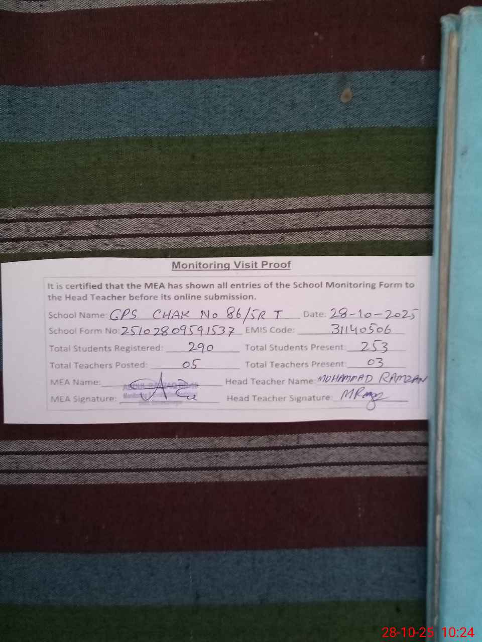 | EMIS Code: 31140506 | Name of School: GPS CHAK NO 86/5-R T | |||