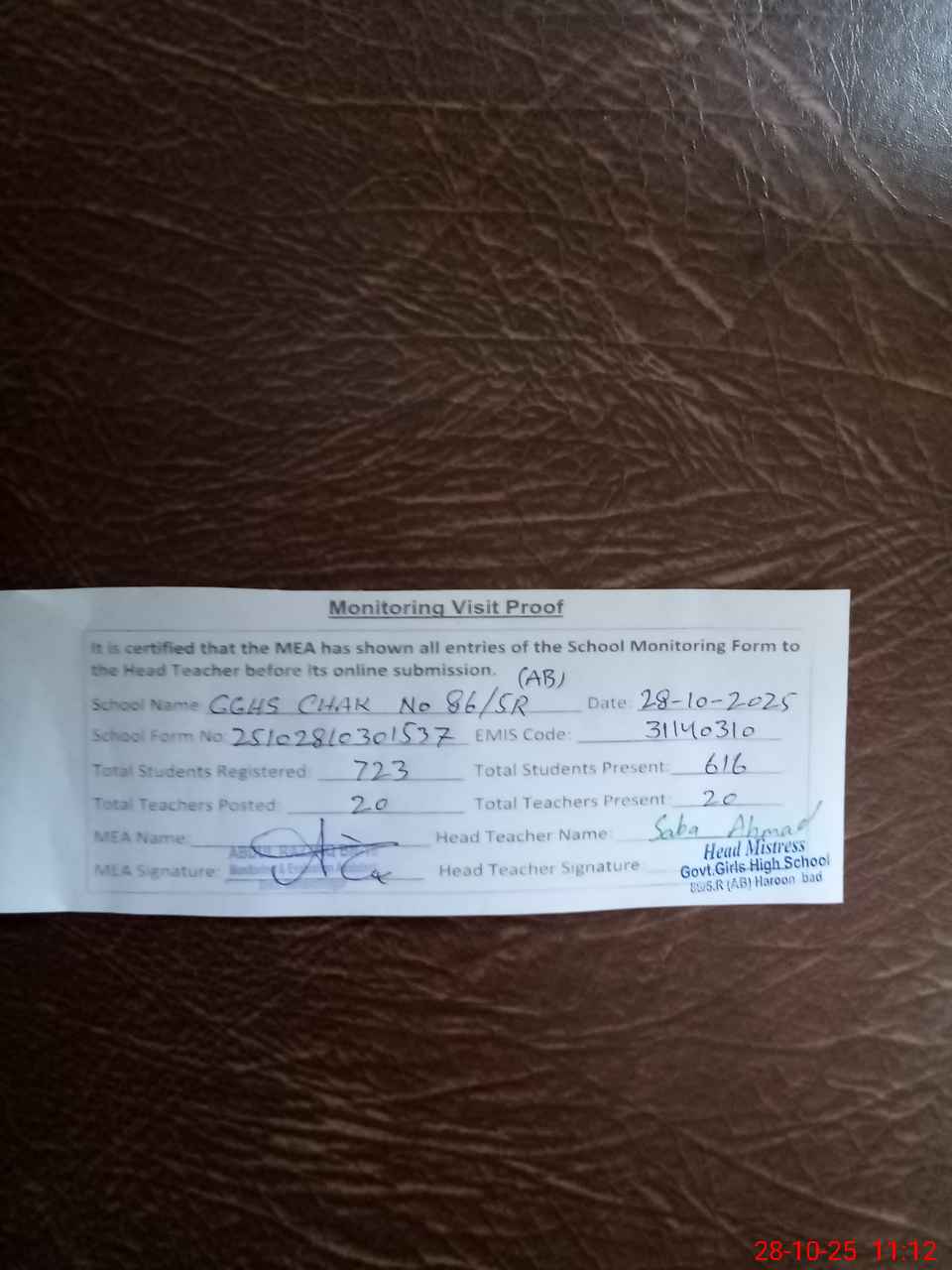 | Attendance Register | Head Teacher | MEA with School | Visit Proof |