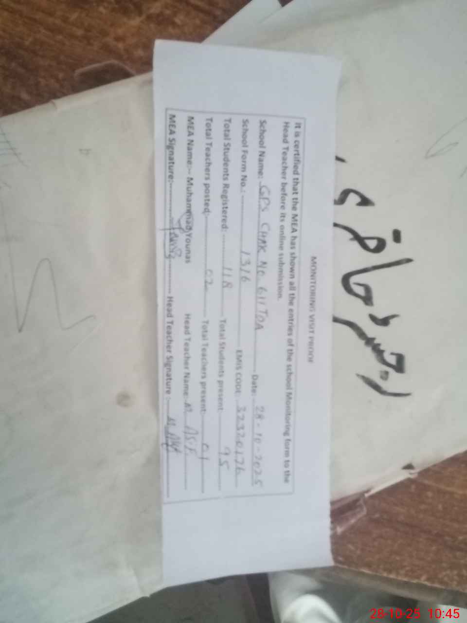 | Attendance Register | Head Teacher | MEA with School | Visit Proof |