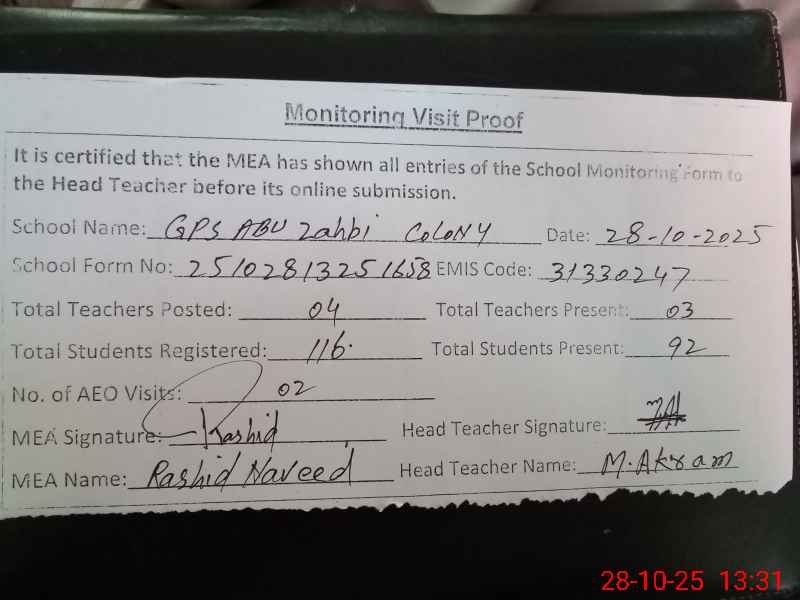 | EMIS Code: 31330247 | Name of School: GPS ABU ZAHBI COLONY NO. 4 | |||