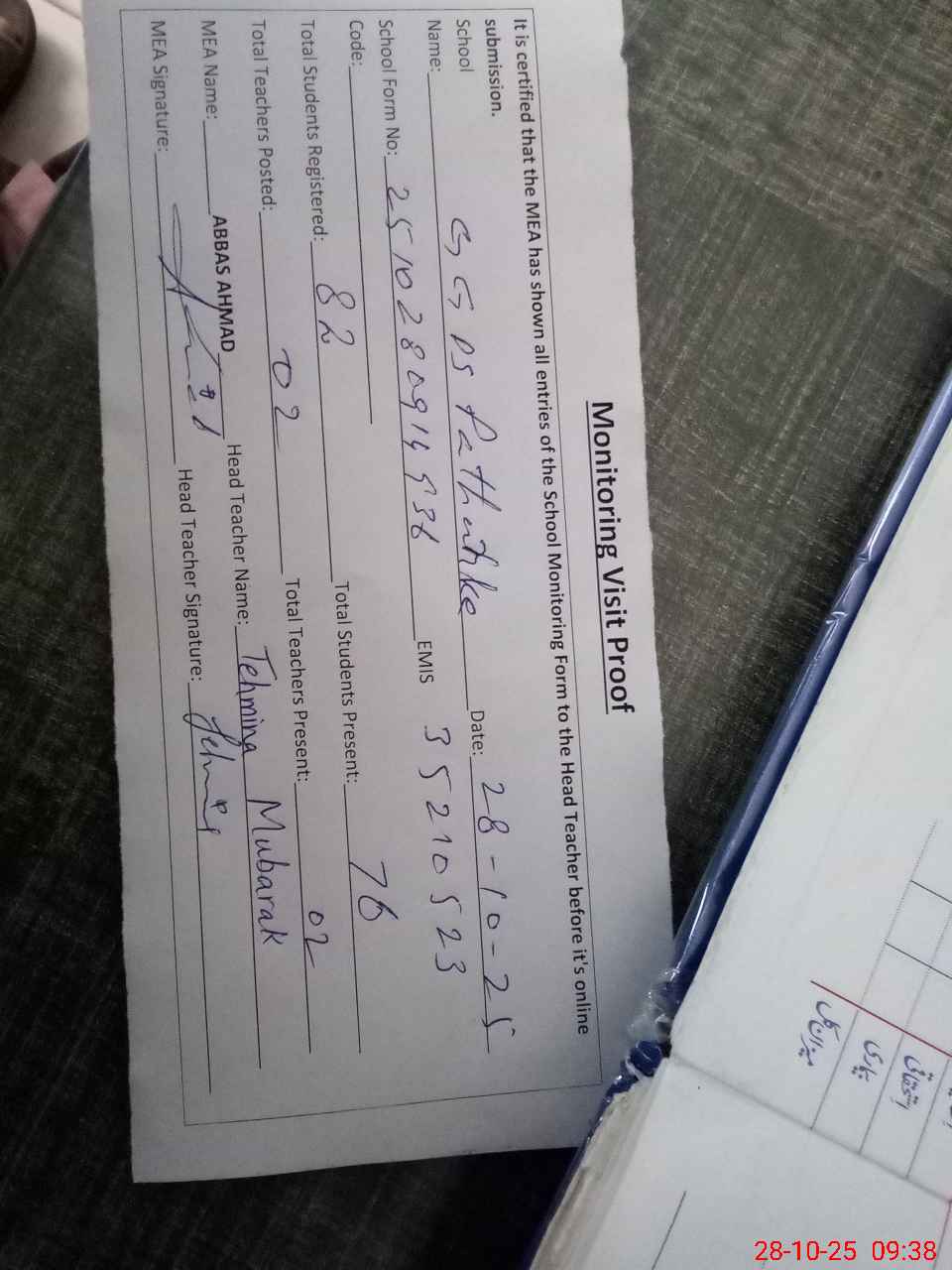 | Attendance Register | Head Teacher | MEA with School | Visit Proof |