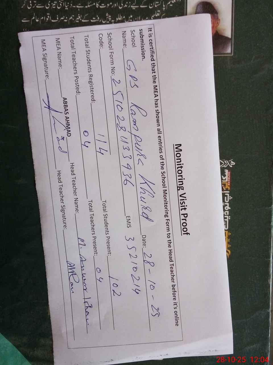 | EMIS Code: 35210214 | Name of School: GPS RAM PURA KHURD | |||