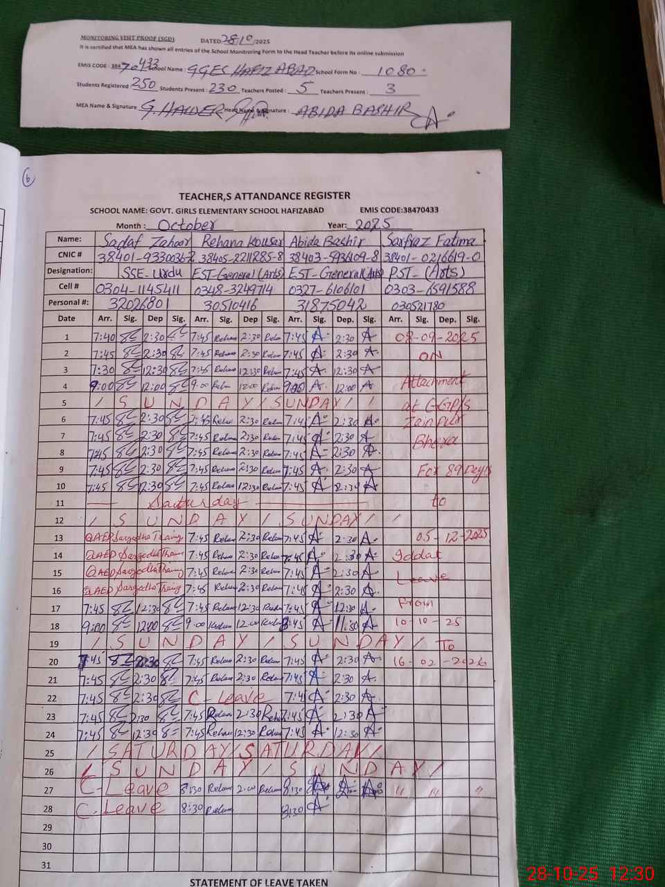 | Remarks (Use Separate Page if Required): SARFRAZ FATIMA IS ON IDDAT LEAVE BUT SHOW HIM EARNED LEAVE | |||||