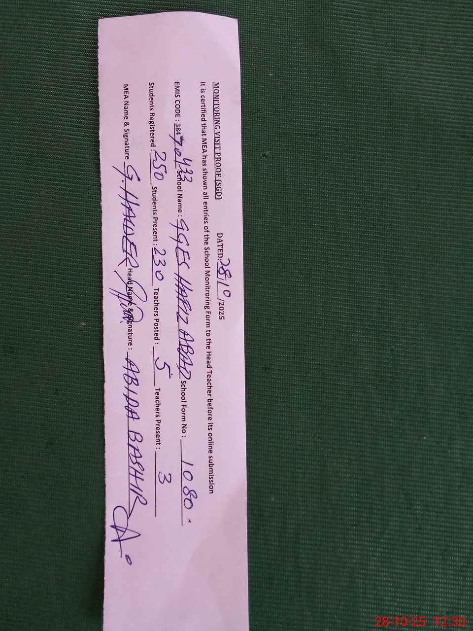 | Monitoring Date: 28-10-2025 | Start Time: 28-10-2025 11:55 AM | End Time: 28-10-2025 12:30 PM | Name of MEA: GH**** HA**** | |