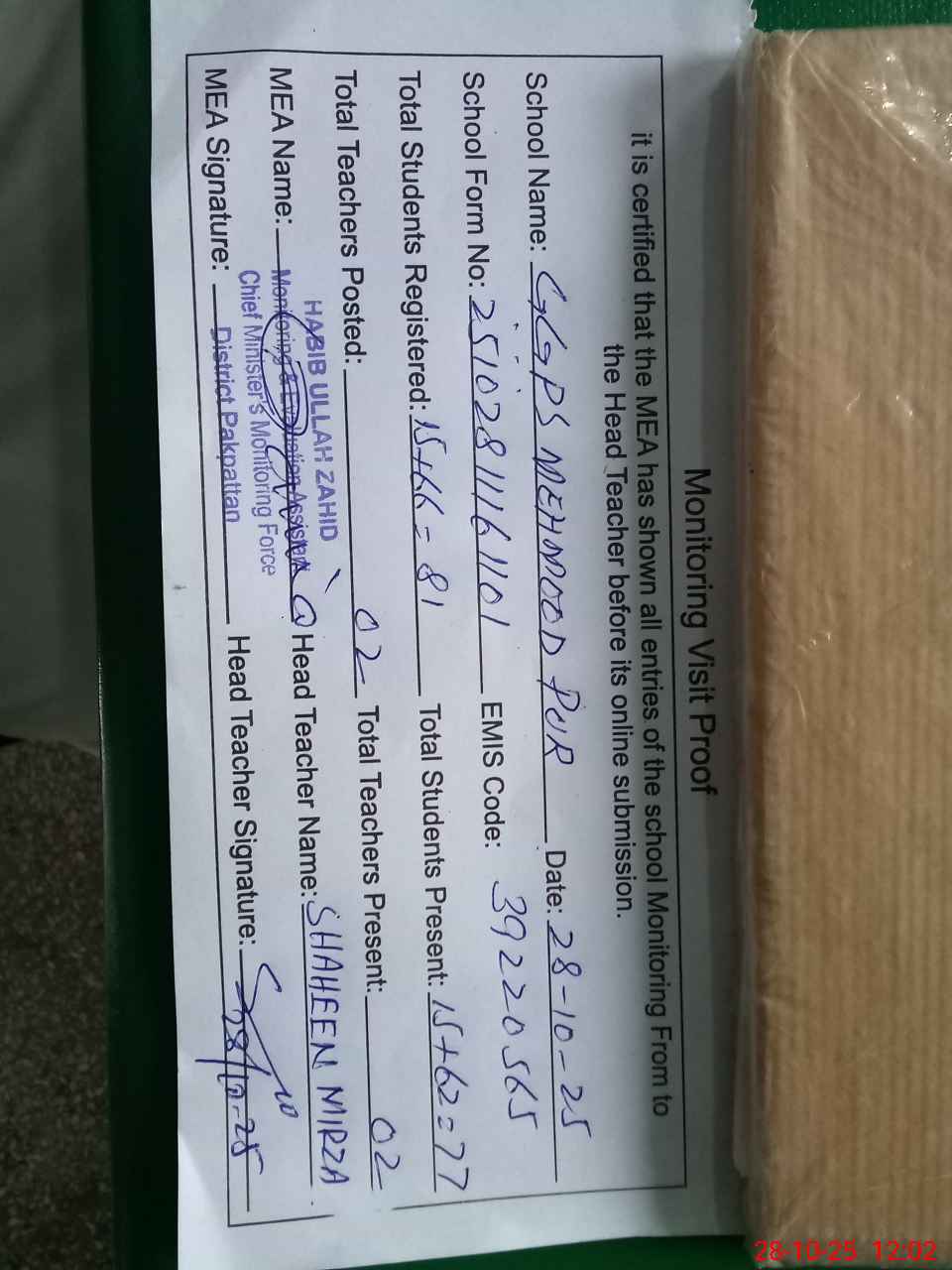 | Attendance Register | Head Teacher | MEA with School | Visit Proof |