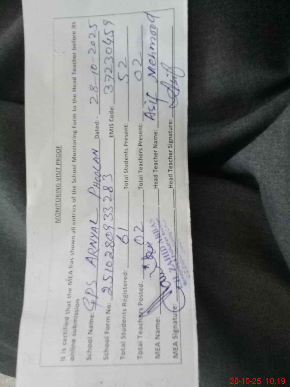 | Monitoring Date: 28-10-2025 | Start Time: 28-10-2025 09:33 AM | End Time: 28-10-2025 10:26 AM | Name of MEA: Za**** Ab**** | |