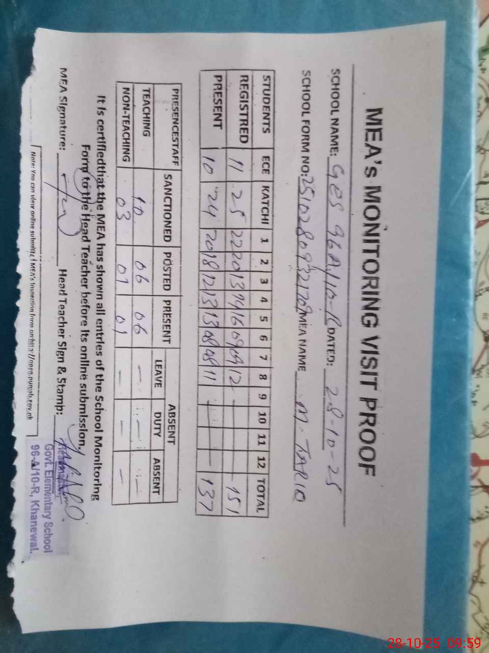 | Attendance Register | Head Teacher | MEA with School | Visit Proof |