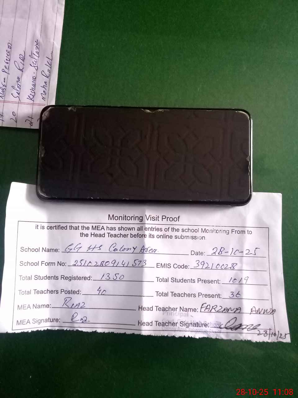 | Attendance Register | Head Teacher | MEA with School | Visit Proof |