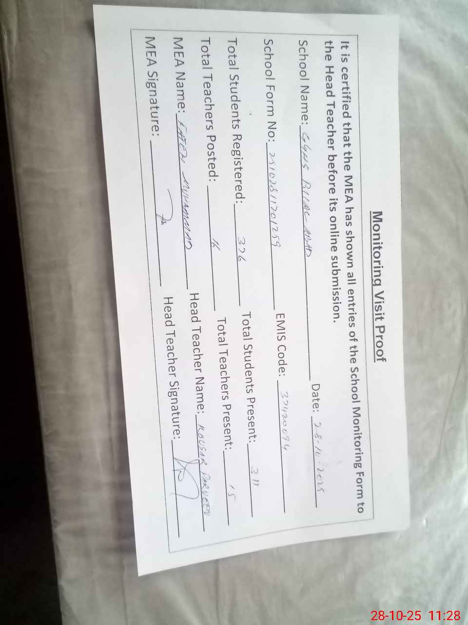 | Attendance Register | Head Teacher | MEA with School | Visit Proof |