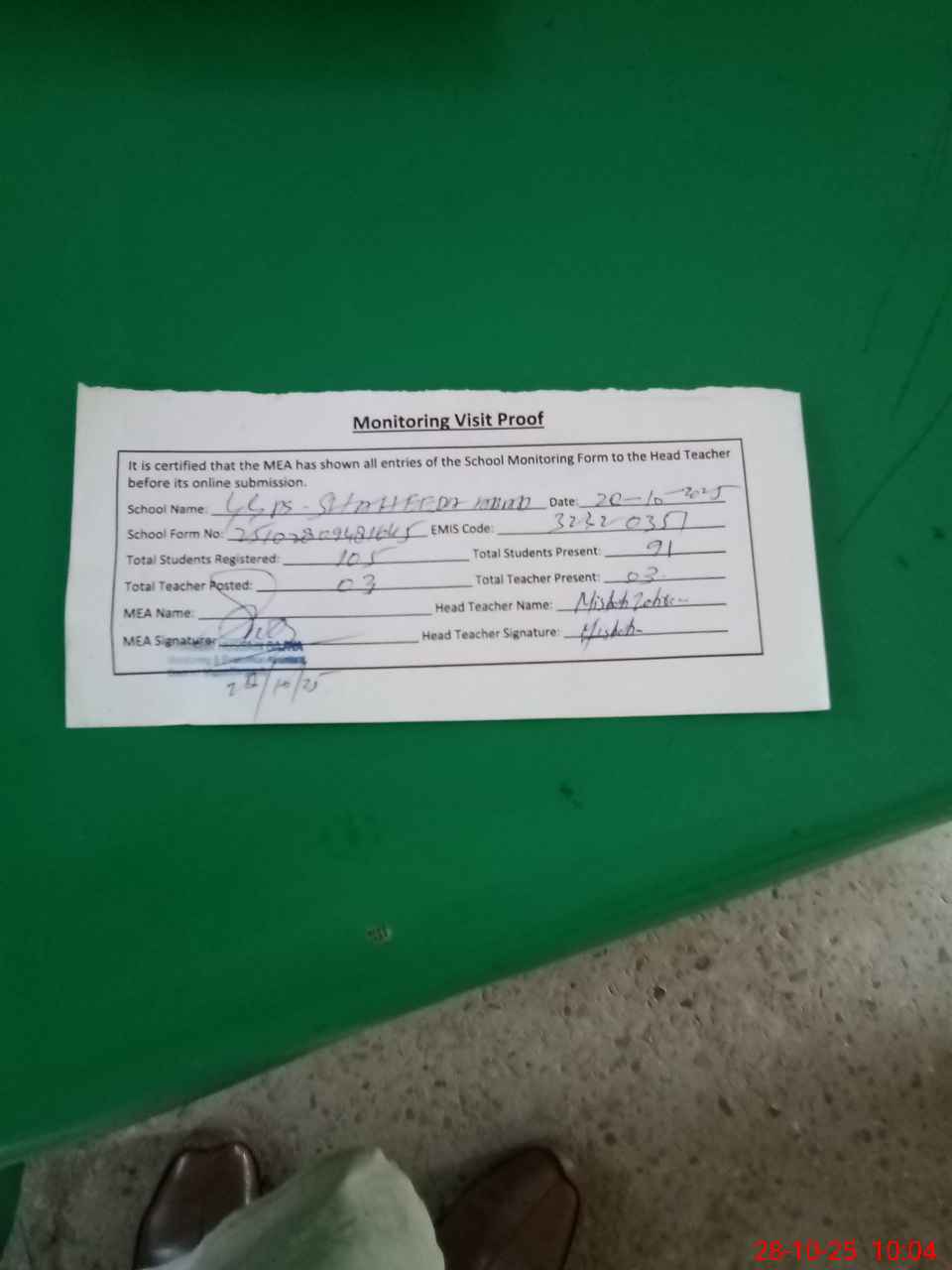 | Attendance Register | Head Teacher | MEA with School | Visit Proof |