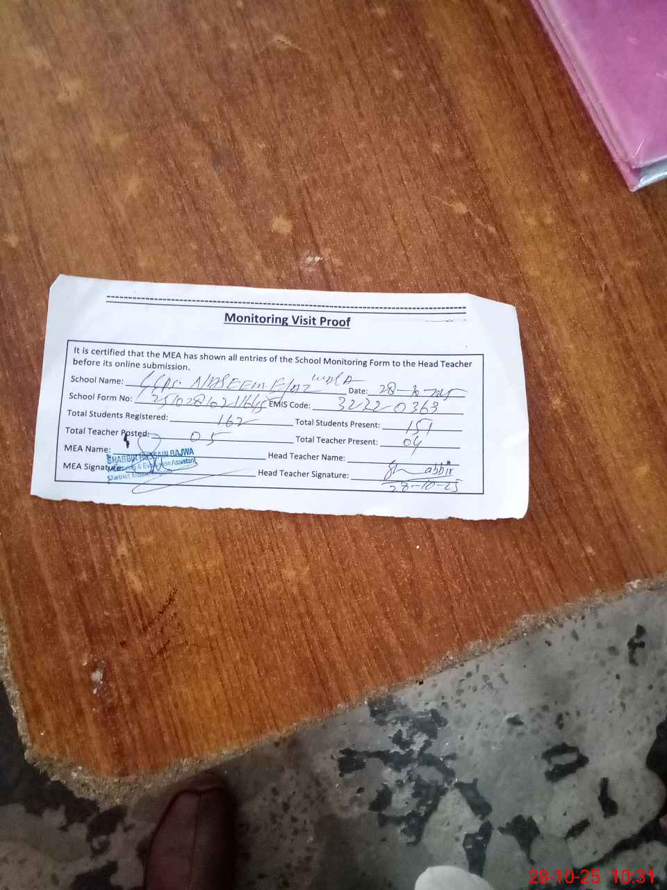 | Attendance Register | Head Teacher | MEA with School | Visit Proof |