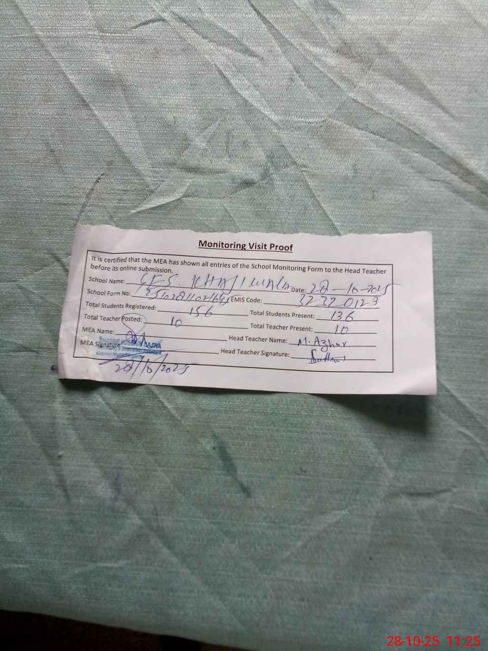 | Attendance Register | Head Teacher | MEA with School | Visit Proof |