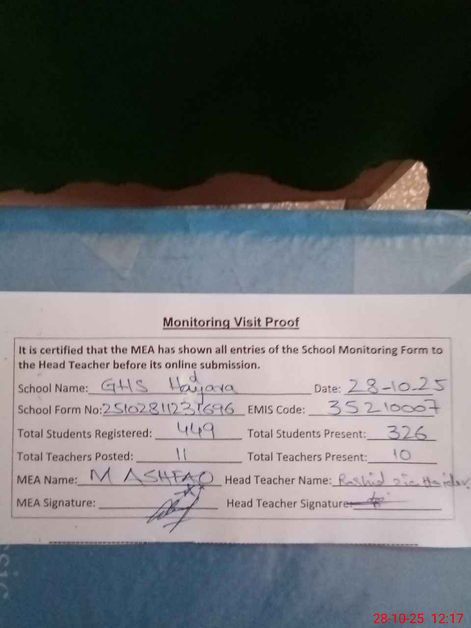 | Remarks (Use Separate Page if Required): School has total 12 toilets while 06 toilets non functional due to looking so old and dangerous Head Master Rashid Zia Haider shown casual leave on attendances register while his leave still not approved by DEO so mark him absent today School has total 17 rooms where as 05 classrooms are dangerous and 02 classrooms are in use while 03 classrooms are not in use School has very large ground need to cut the grass property looking muddy 35210007 | |||||