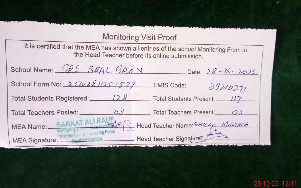 | EMIS Code: 39210271 | Name of School: GPS SEAL GAON P/O CHAK BEDI PAKPATTAN | |||