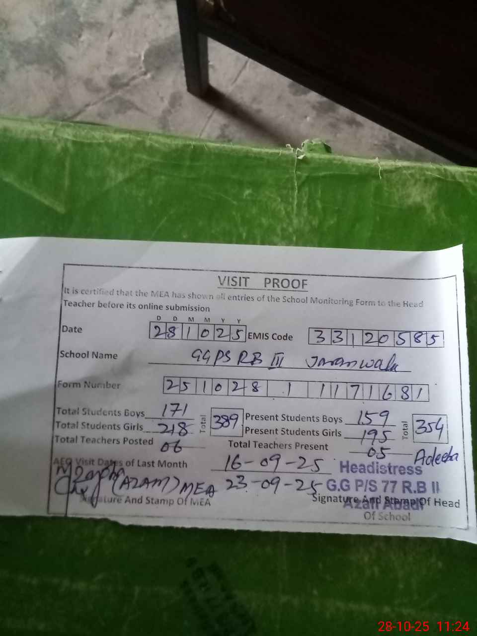 | Attendance Register | Head Teacher | MEA with School | Visit Proof |