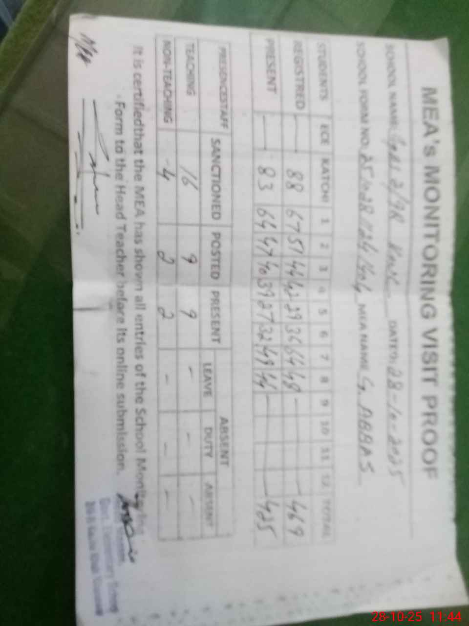 | Attendance Register | Head Teacher | MEA with School | Visit Proof |