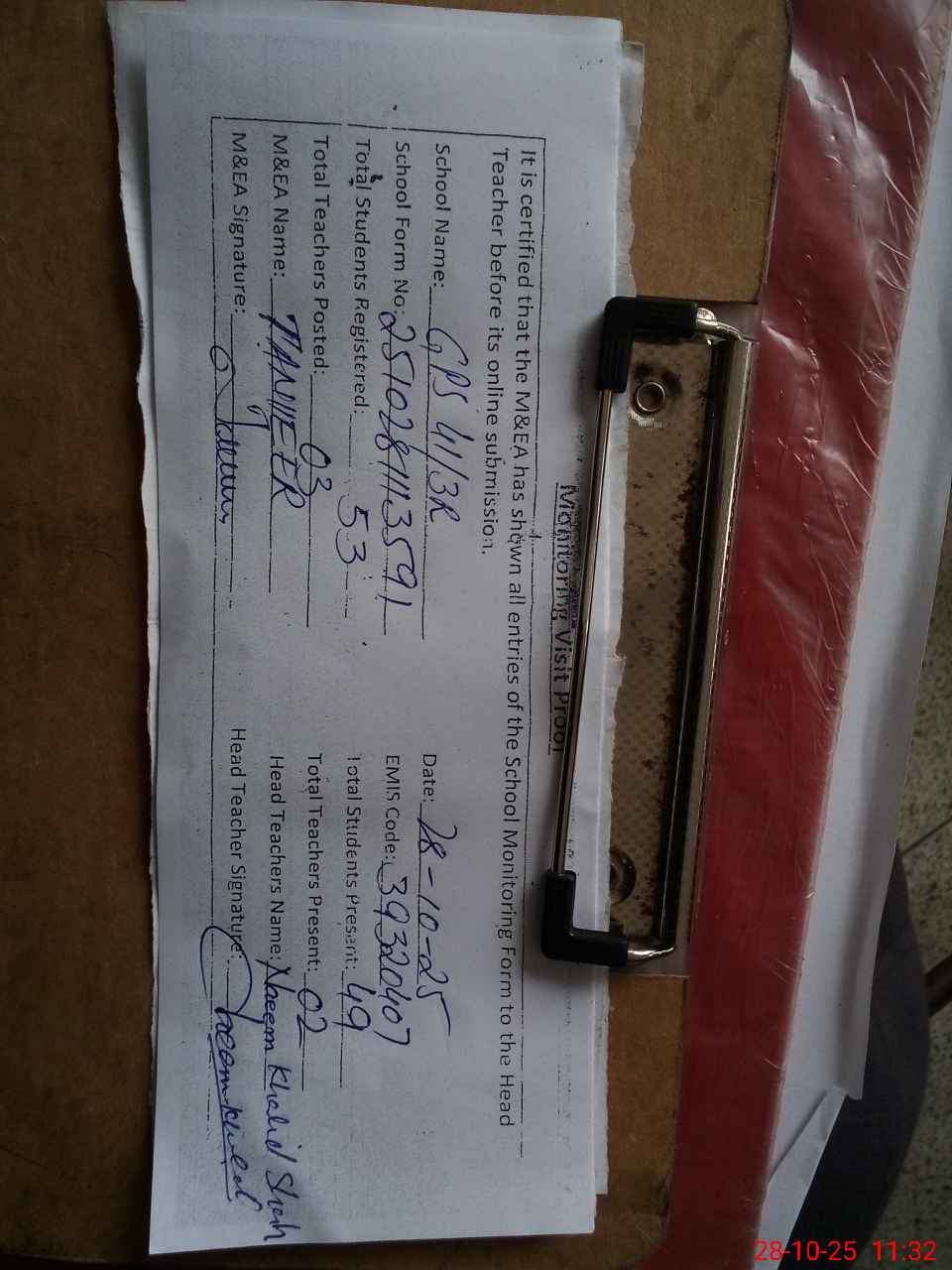 | Attendance Register | Head Teacher | MEA with School | Visit Proof |
