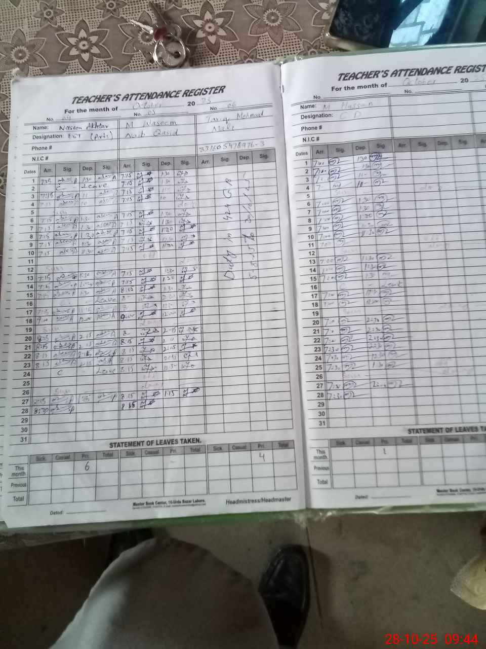 | Remarks (Use Separate Page if Required): MUHAMMAD HUSSAIN CKDR ATTENDANCE WAS MARKED IN ATTENDANCE REGISTER AT 0730 HRS BUT PHYSICALLY HE WAS NOT PRESENT IN THE SCHOOL AT MY ARRIVEL SO HE WAS MARKED ABSENT AS PER SOP MAIN GATE WAS FOUND UNATTENDED AT MY ARRIVEL | |||||