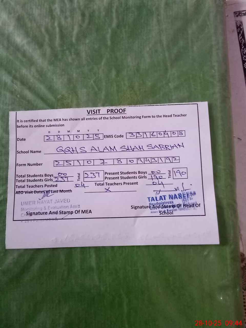 | EMIS Code: 33160408 | Name of School: GGHS ALAM SHAH SARIAN | |||