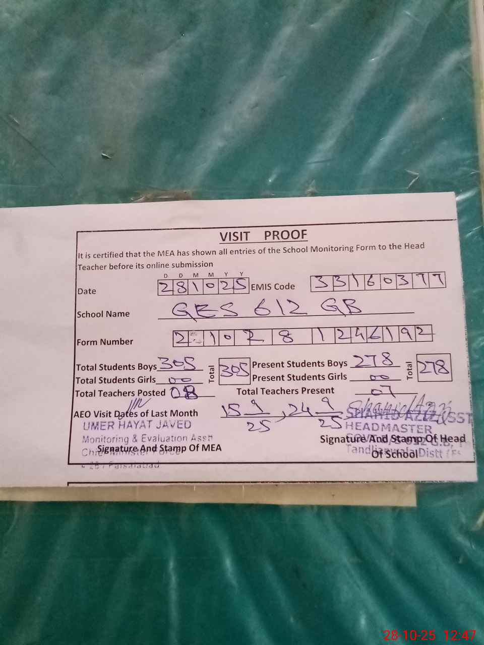 | EMIS Code: 33160377 | Name of School: GES CHAK NO.612/GB | |||