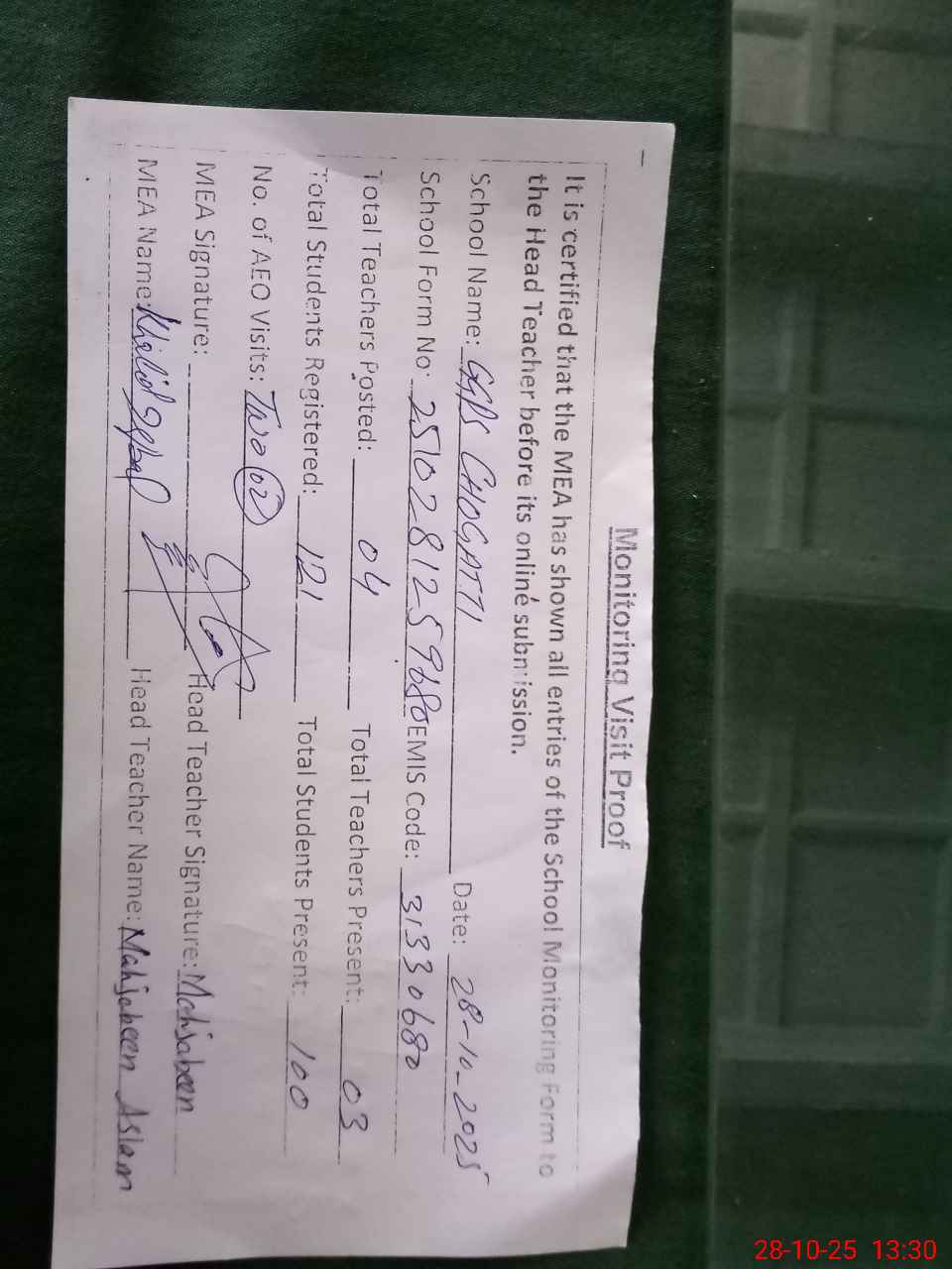 | Attendance Register | Head Teacher | MEA with School | Visit Proof |