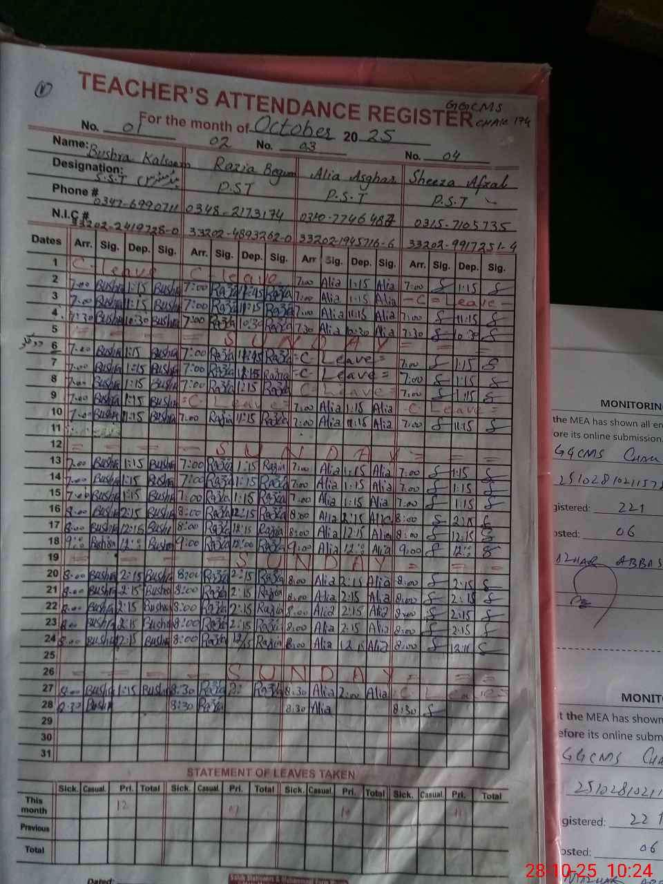 | Monitoring Date: 28-10-2025 | Start Time: 28-10-2025 09:09 AM | End Time: 28-10-2025 10:27 AM | Name of MEA: J-**** MA**** AB**** | |