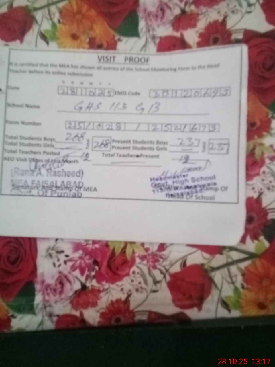 | Attendance Register | Head Teacher | MEA with School | Visit Proof |