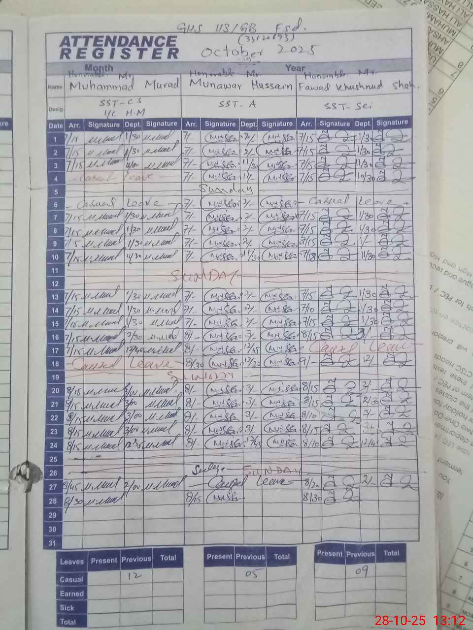 | CNIC | Full Name | Designation | R/C | Absence during last cal. month |