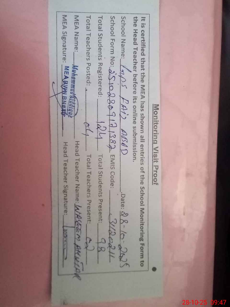 | Attendance Register | Head Teacher | MEA with School | Visit Proof |