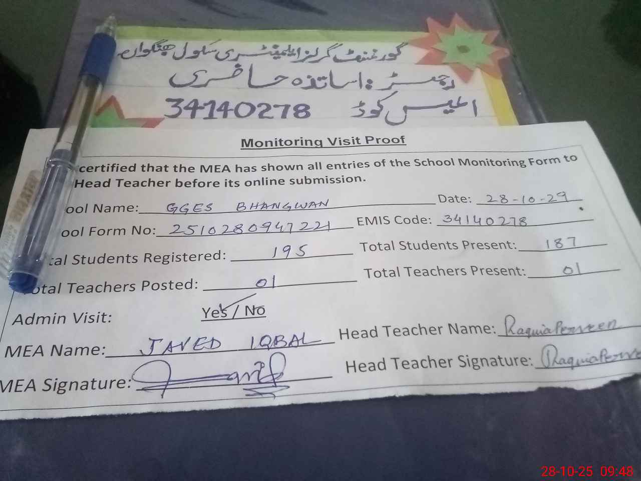 | Attendance Register | Head Teacher | MEA with School | Visit Proof |